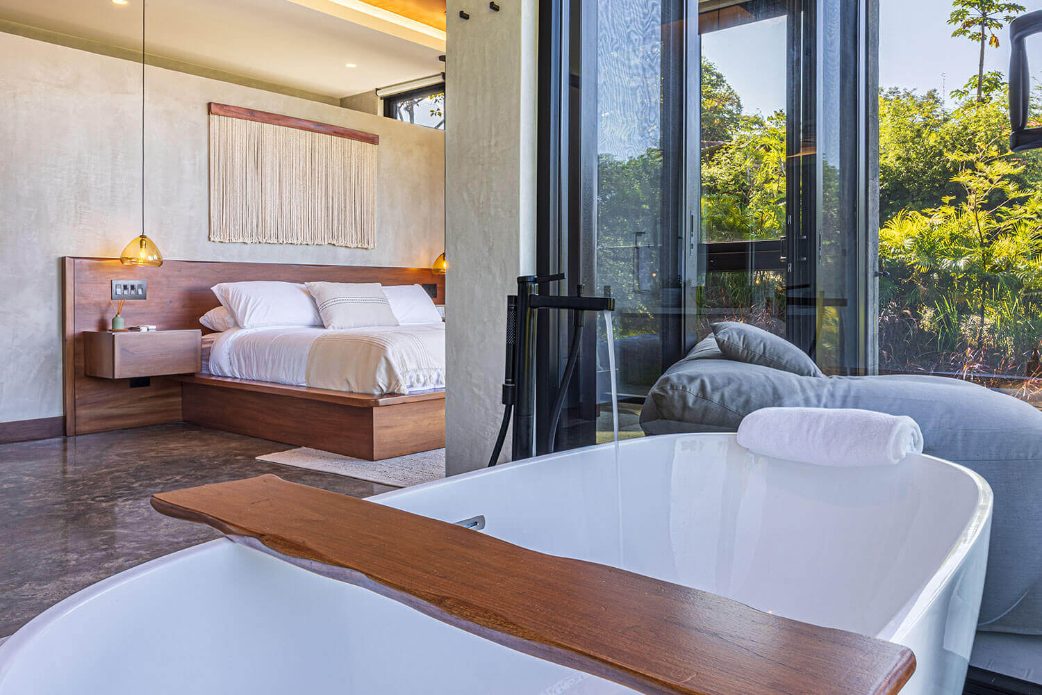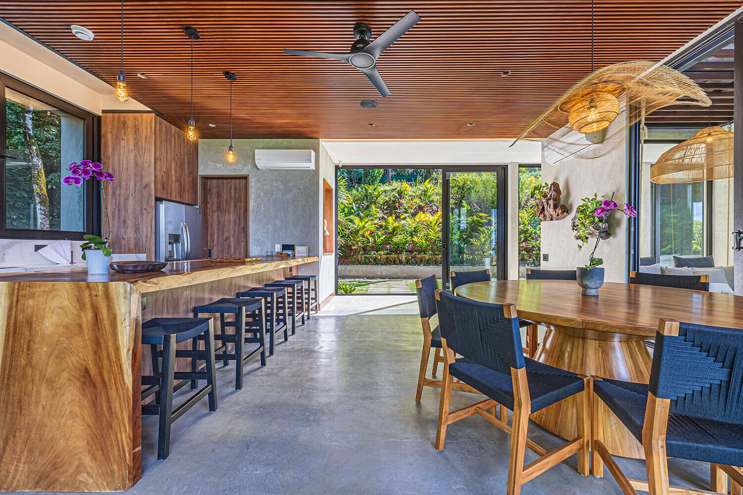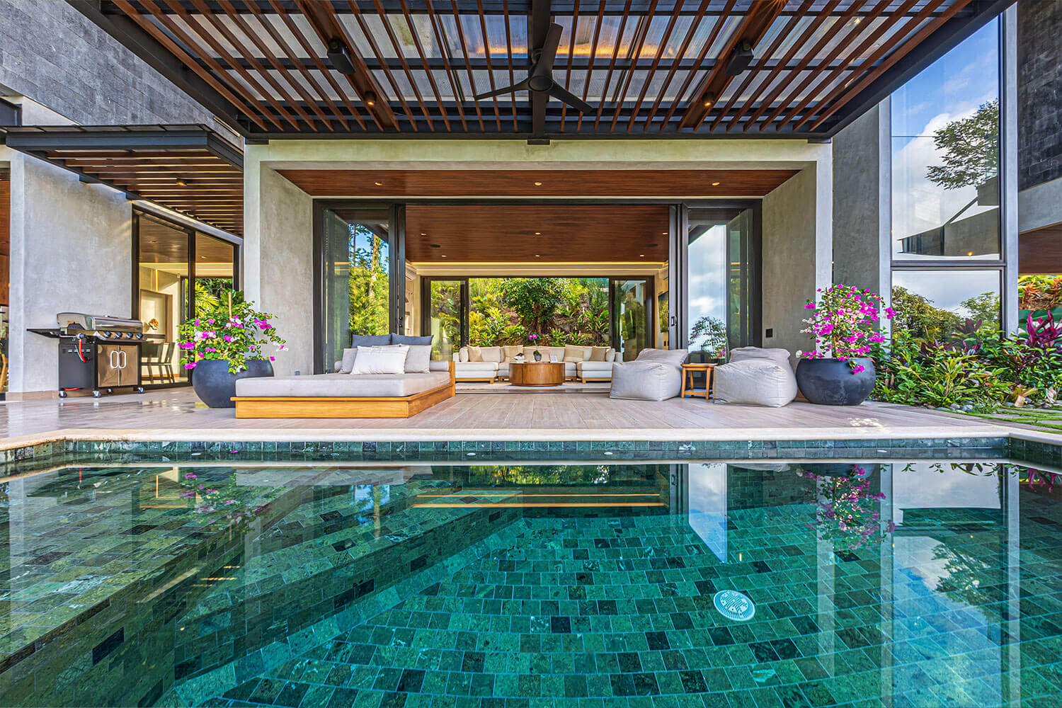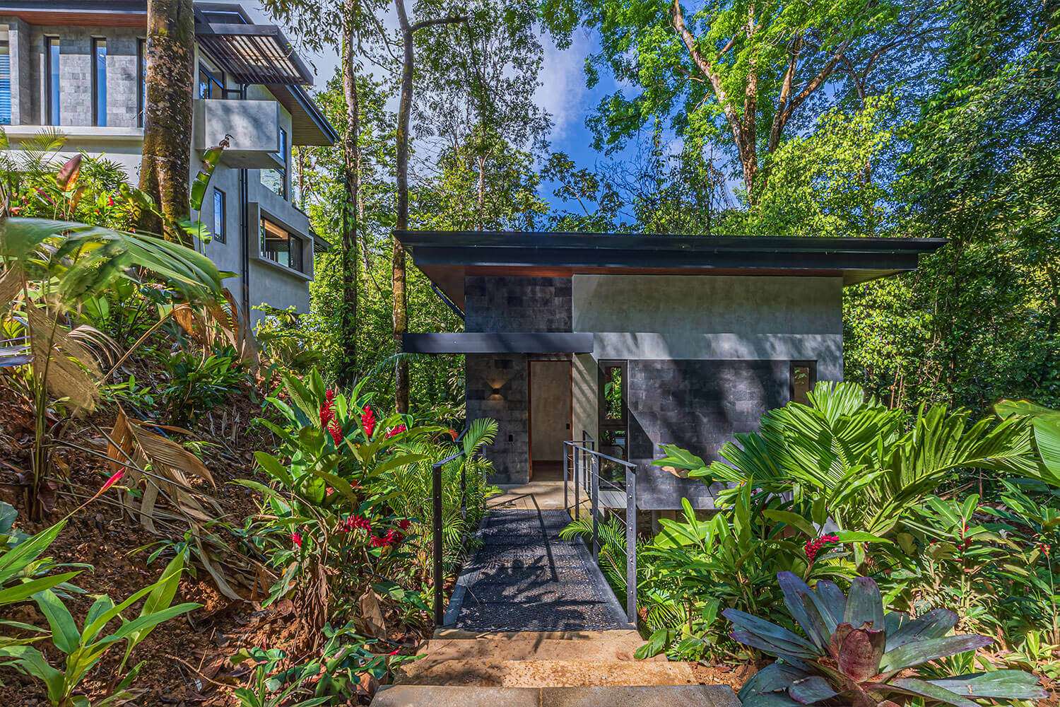 The main residence features three beautifully appointed bedrooms, including a serene primary suite with a soaking bathtub, walk-in closet, safe and beverage fridge. Below the home, the secluded Jungle Room is immersed in nature, offering a deeply peaceful and private escape, comfortably sleeping up to three persons. A fifth bedroom functions as an independent studio-style suite with its own private entrance, air conditioning, full bathroom, and kitchenette—ideal for guests seeking complete privacy.