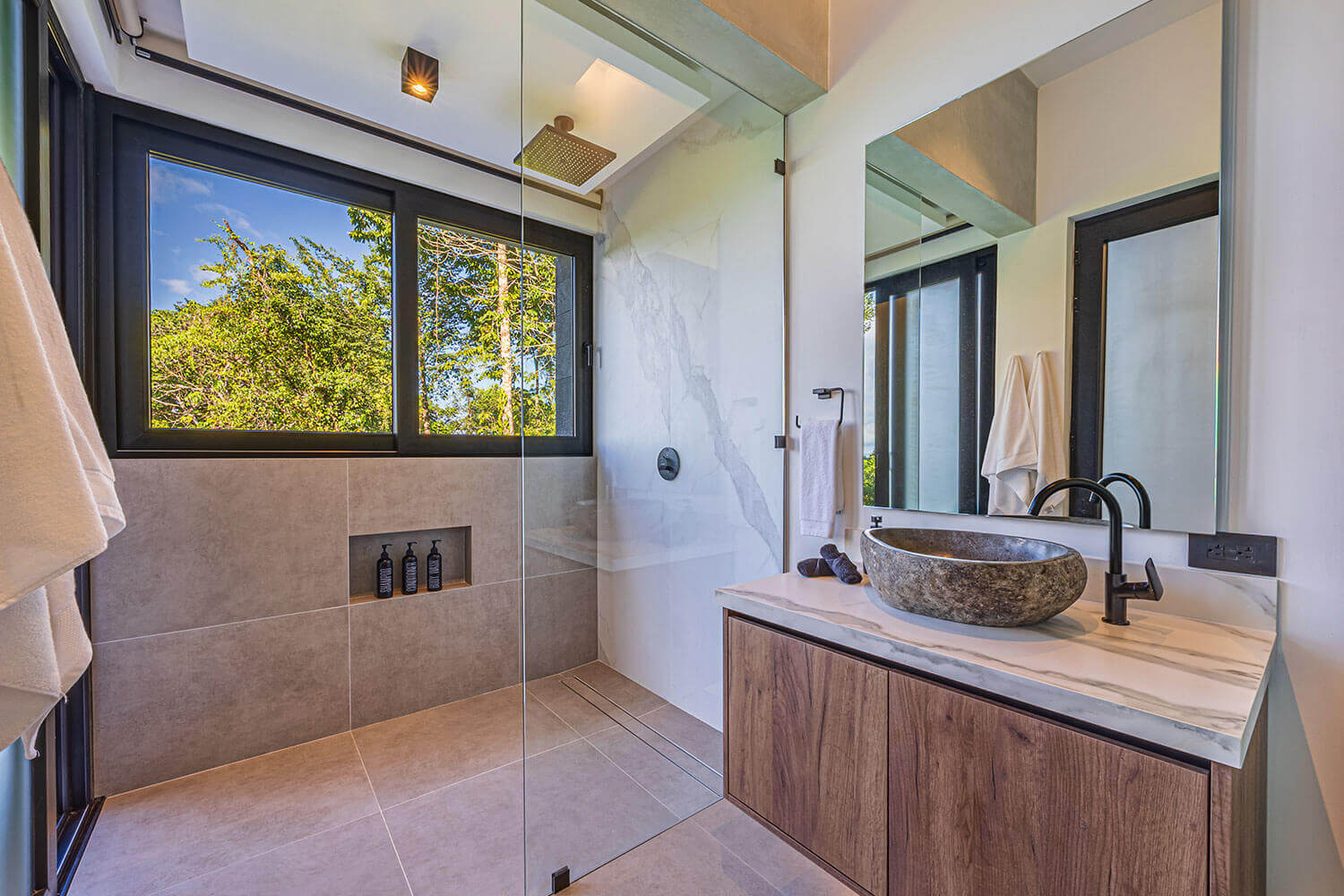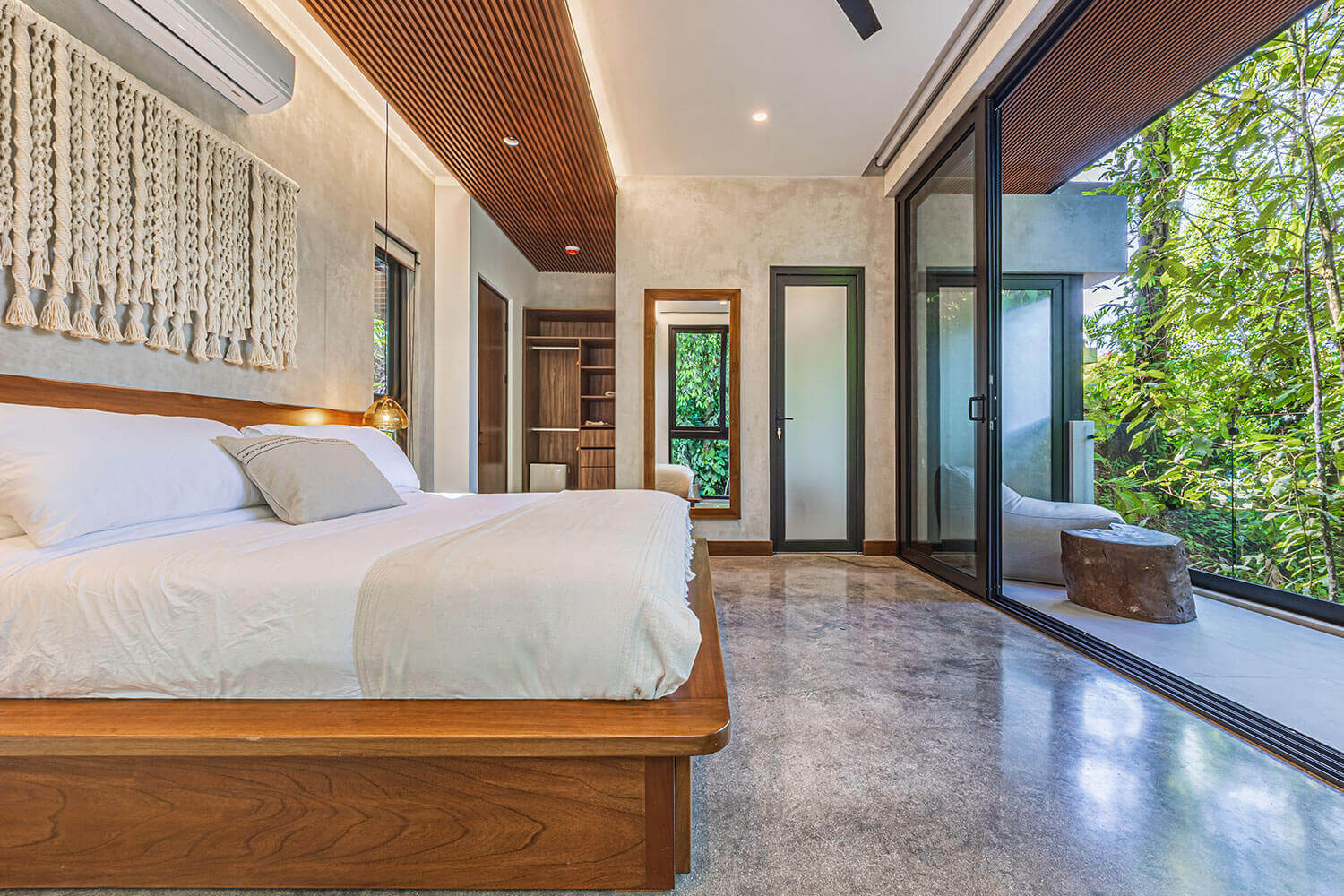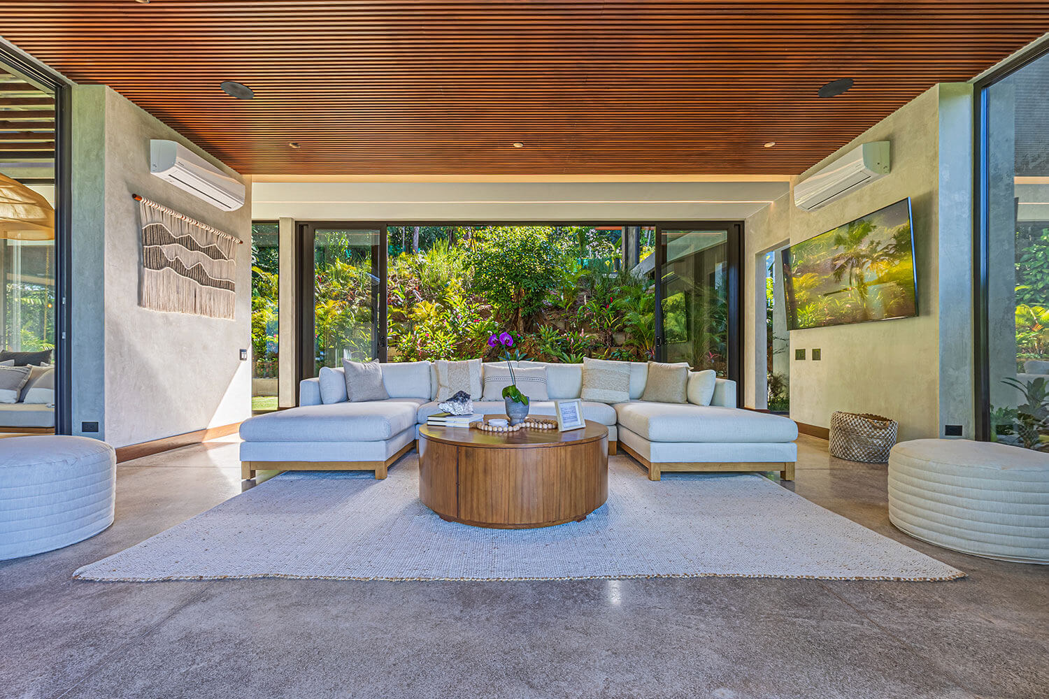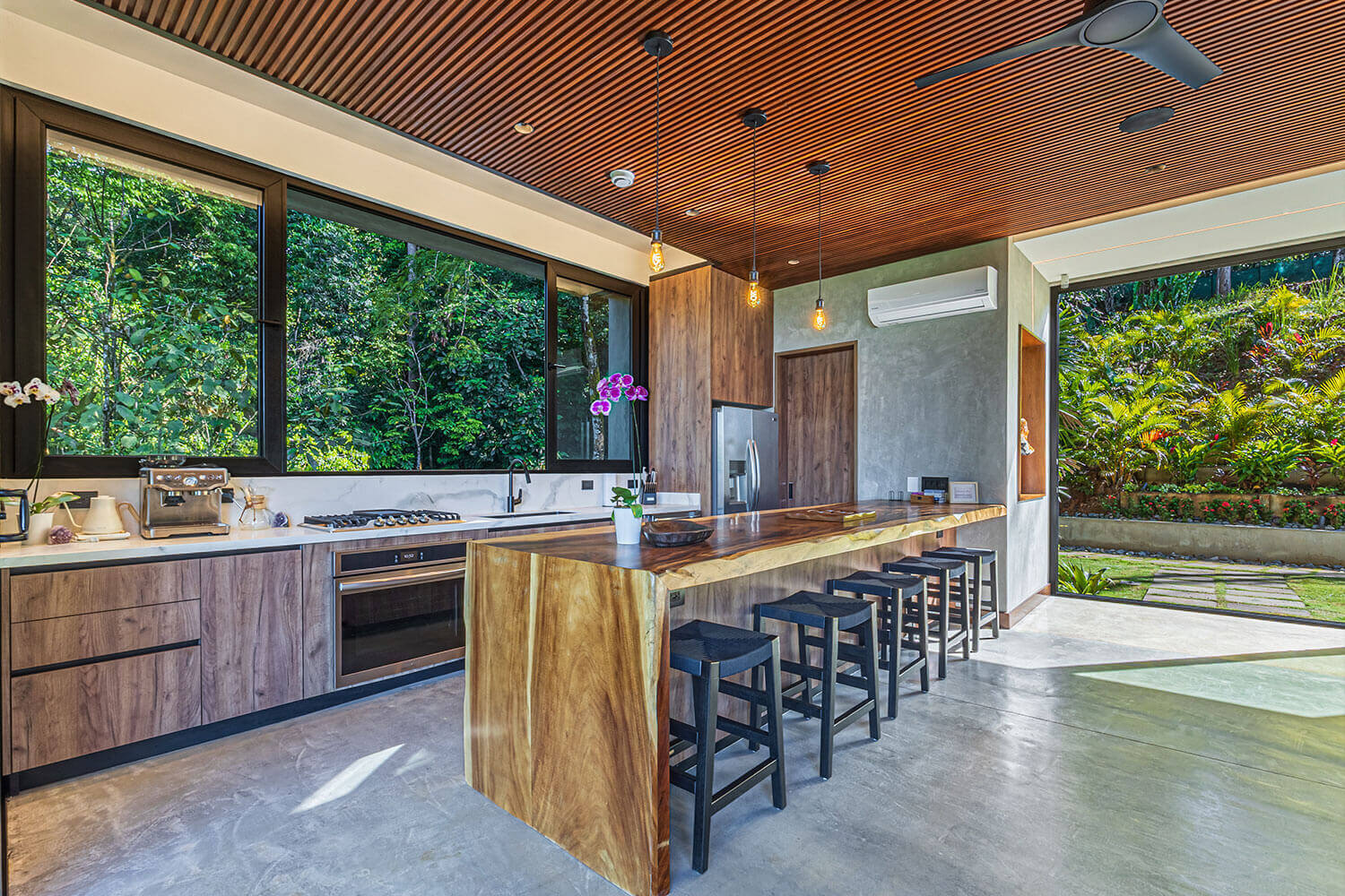 The main residence features three beautifully appointed bedrooms, including a serene primary suite with a soaking bathtub, walk-in closet, safe and beverage fridge. Below the home, the secluded Jungle Room is immersed in nature, offering a deeply peaceful and private escape, comfortably sleeping up to three persons. A fifth bedroom functions as an independent studio-style suite with its own private entrance, air conditioning, full bathroom, and kitchenette—ideal for guests seeking complete privacy.