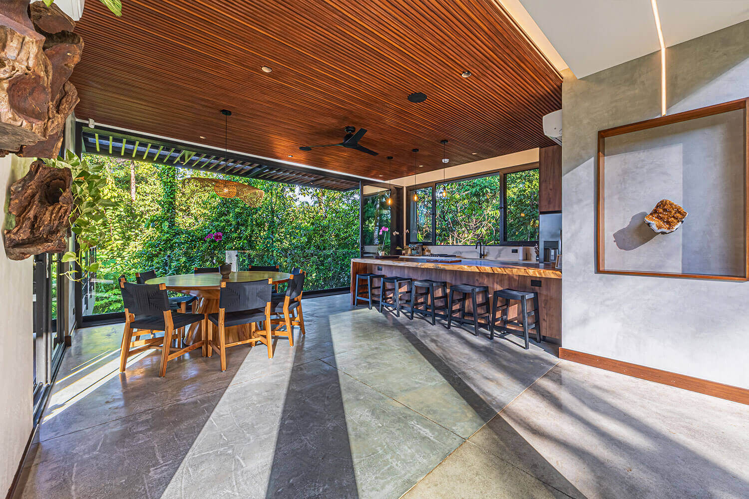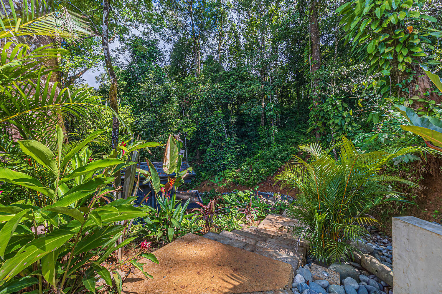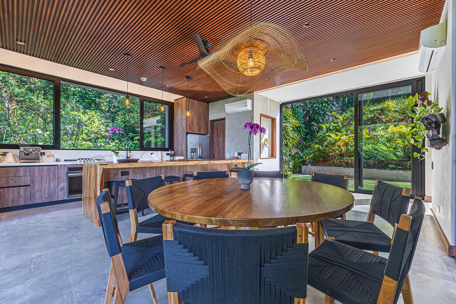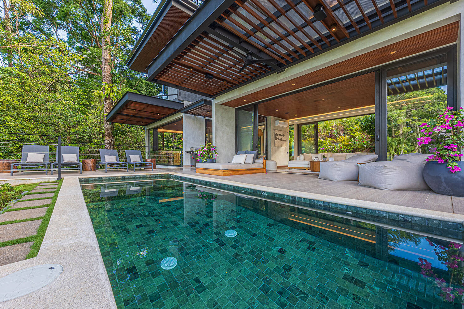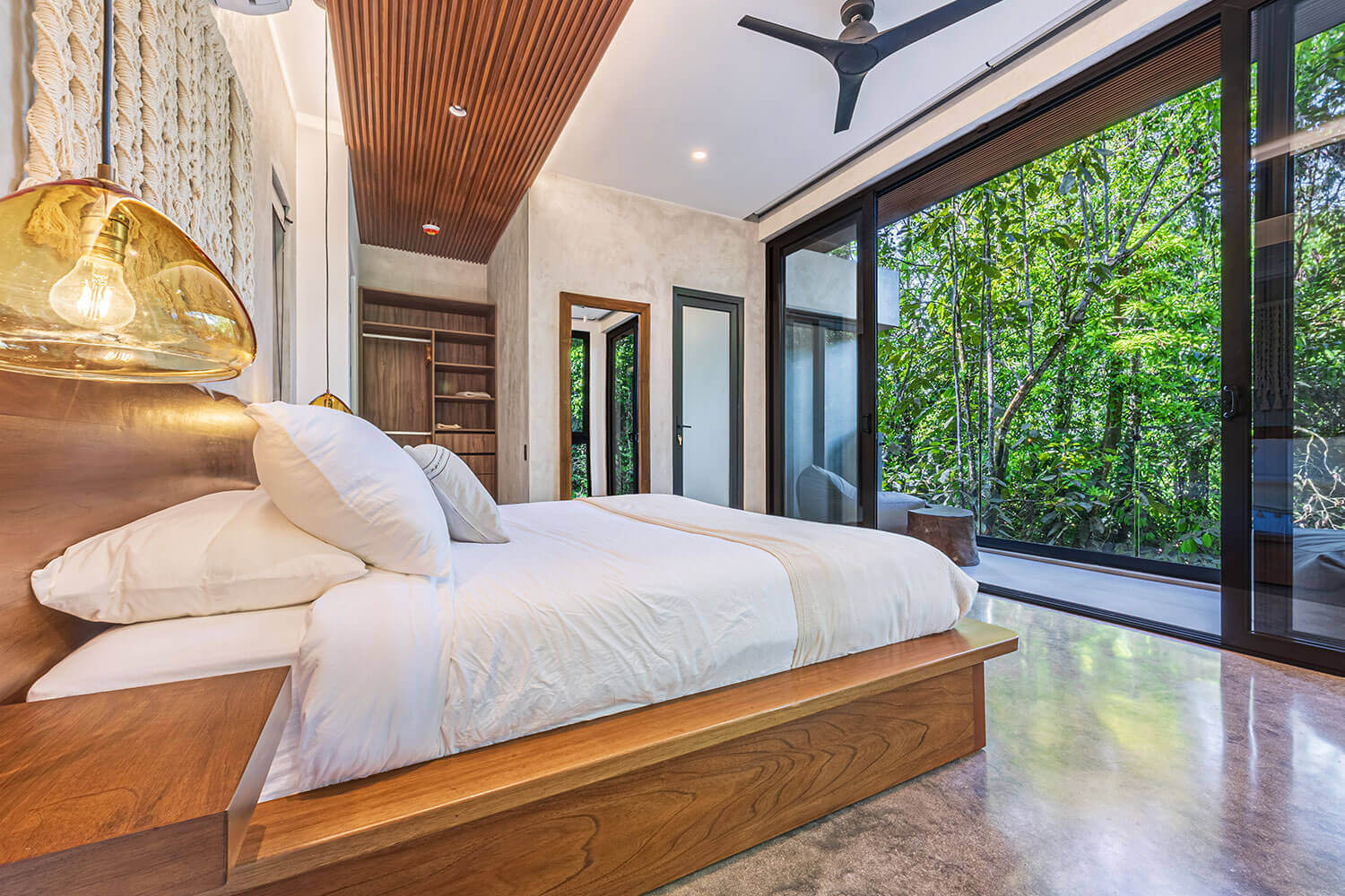 The main residence features three beautifully appointed bedrooms, including a serene primary suite with a soaking bathtub, walk-in closet, safe and beverage fridge. Below the home, the secluded Jungle Room is immersed in nature, offering a deeply peaceful and private escape, comfortably sleeping up to three persons. A fifth bedroom functions as an independent studio-style suite with its own private entrance, air conditioning, full bathroom, and kitchenette—ideal for guests seeking complete privacy.