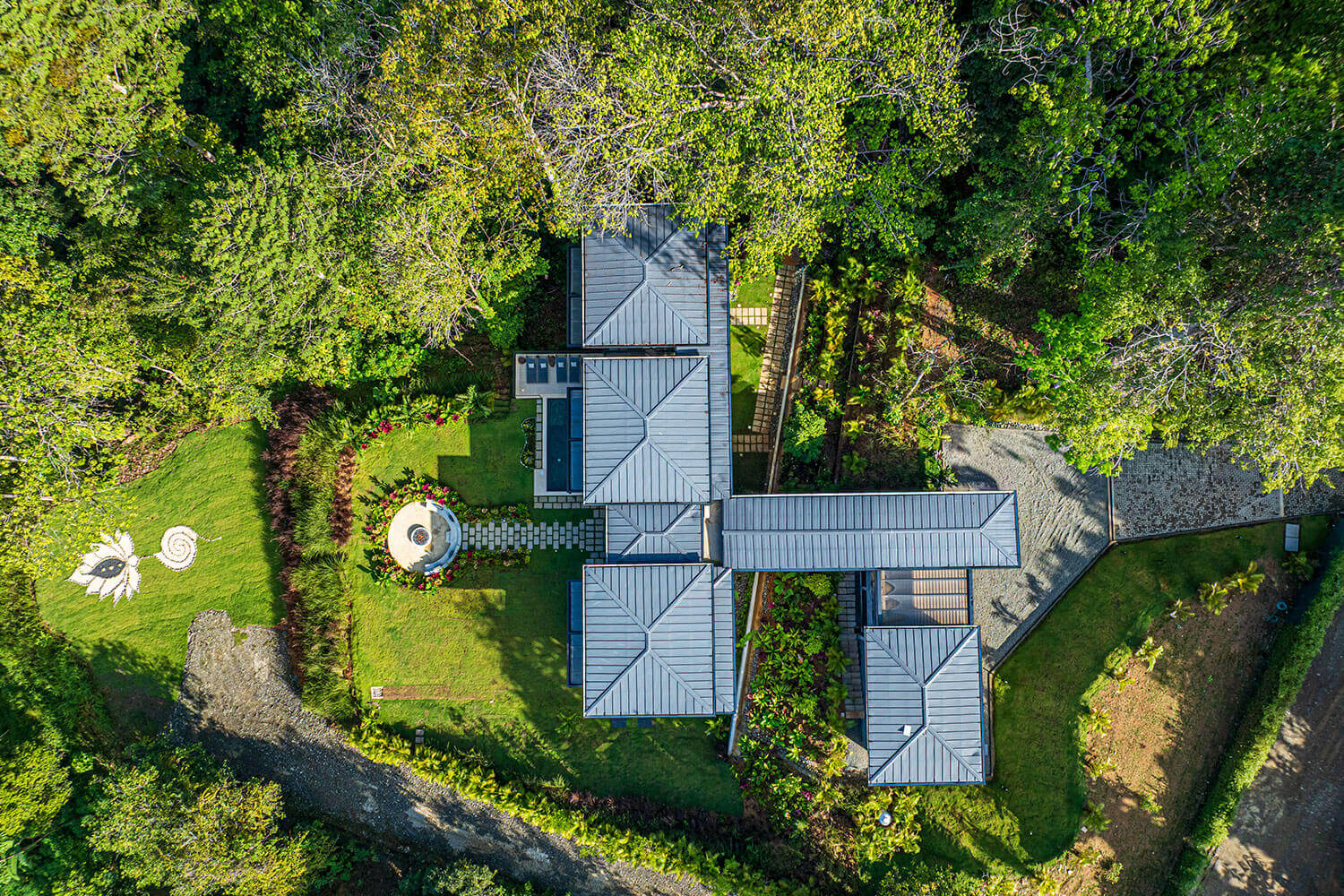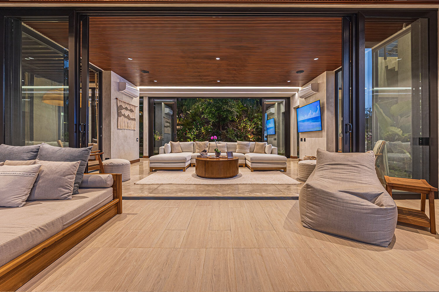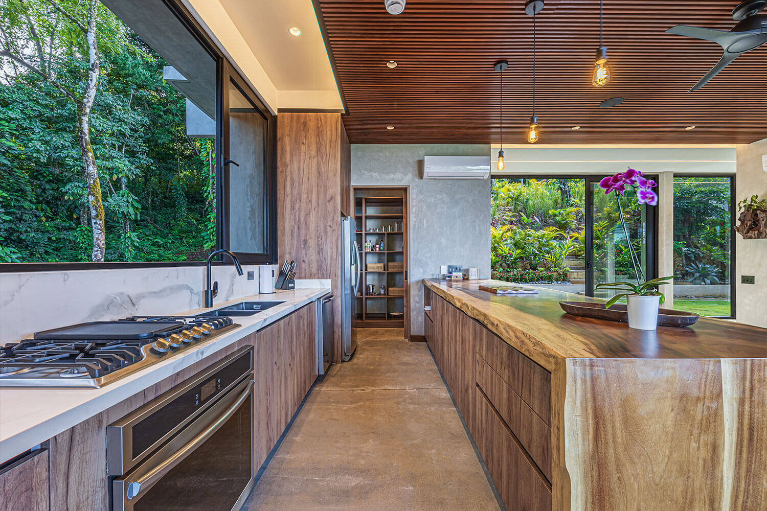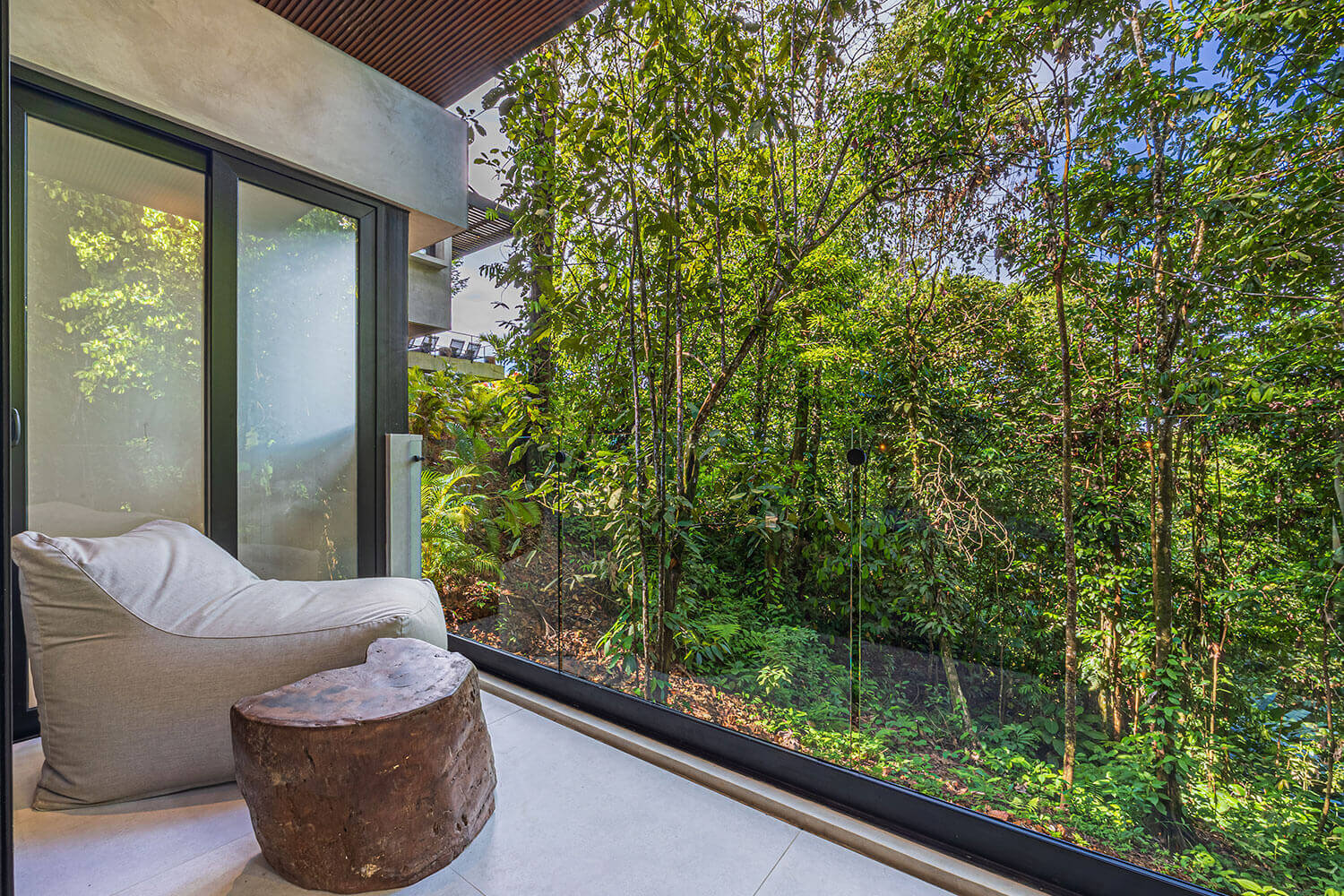 The main residence features three beautifully appointed bedrooms, including a serene primary suite with a soaking bathtub, walk-in closet, safe and beverage fridge. Below the home, the secluded Jungle Room is immersed in nature, offering a deeply peaceful and private escape, comfortably sleeping up to three persons. A fifth bedroom functions as an independent studio-style suite with its own private entrance, air conditioning, full bathroom, and kitchenette—ideal for guests seeking complete privacy.