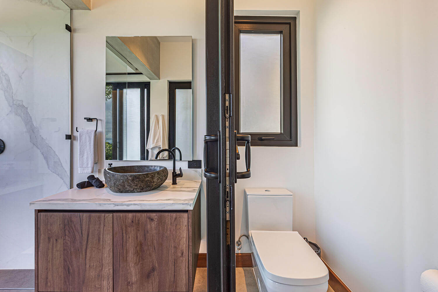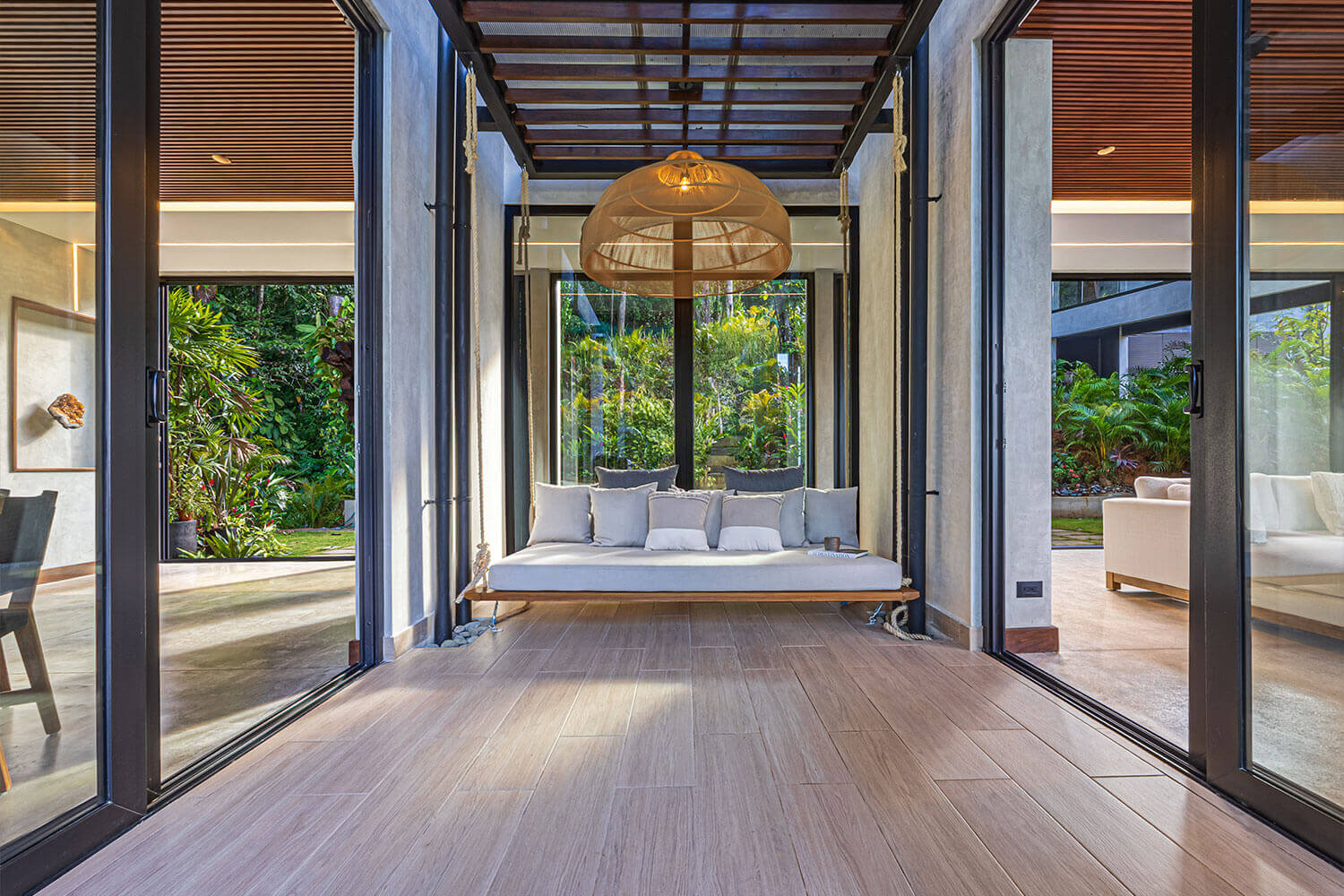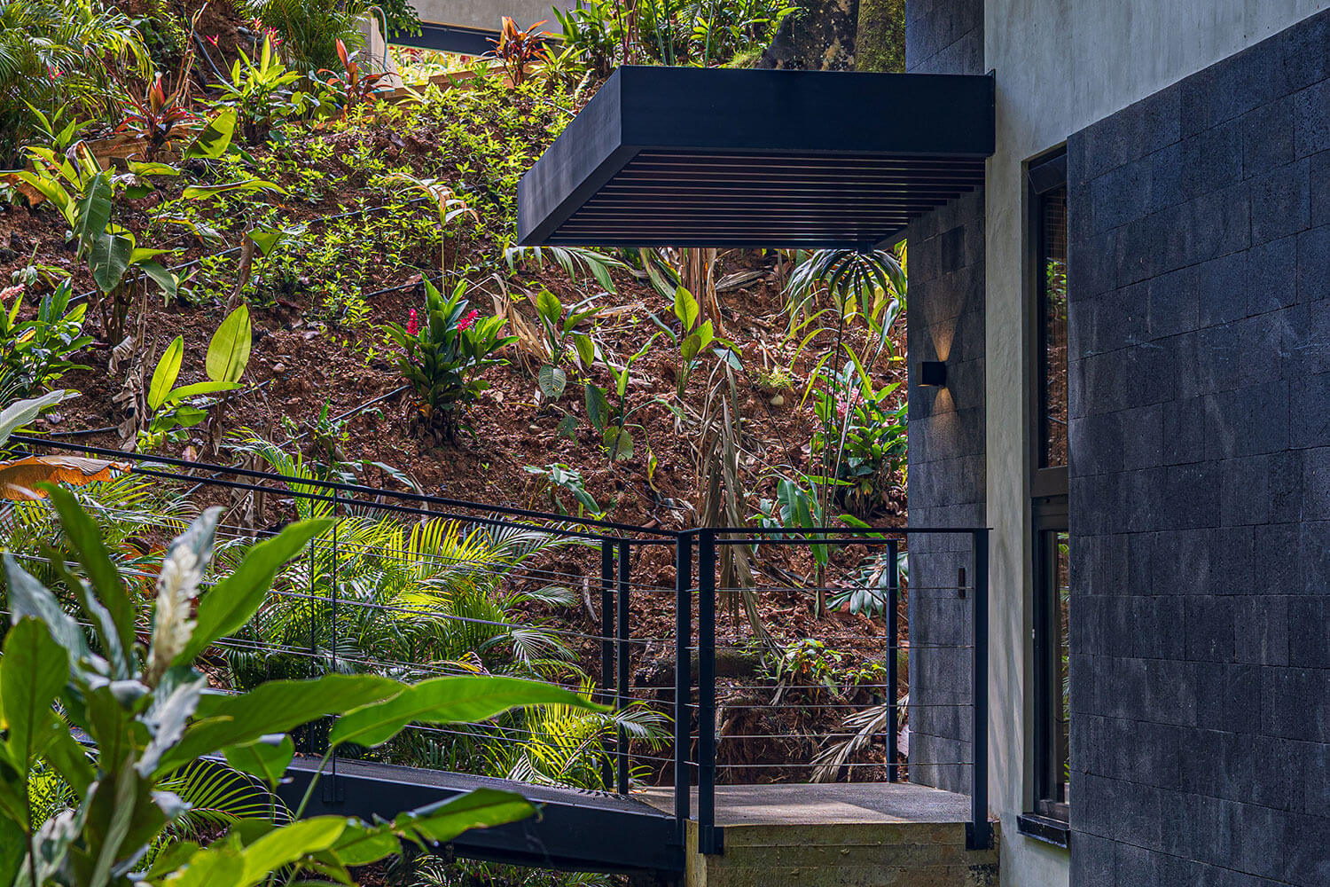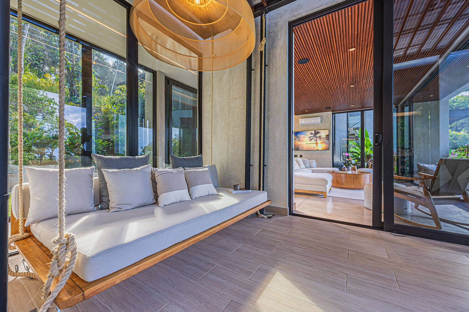 The main residence features three beautifully appointed bedrooms, including a serene primary suite with a soaking bathtub, walk-in closet, safe and beverage fridge. Below the home, the secluded Jungle Room is immersed in nature, offering a deeply peaceful and private escape, comfortably sleeping up to three persons. A fifth bedroom functions as an independent studio-style suite with its own private entrance, air conditioning, full bathroom, and kitchenette—ideal for guests seeking complete privacy.