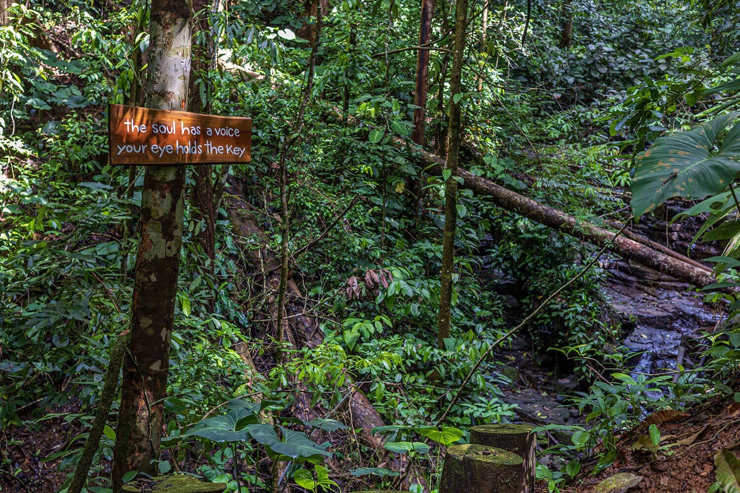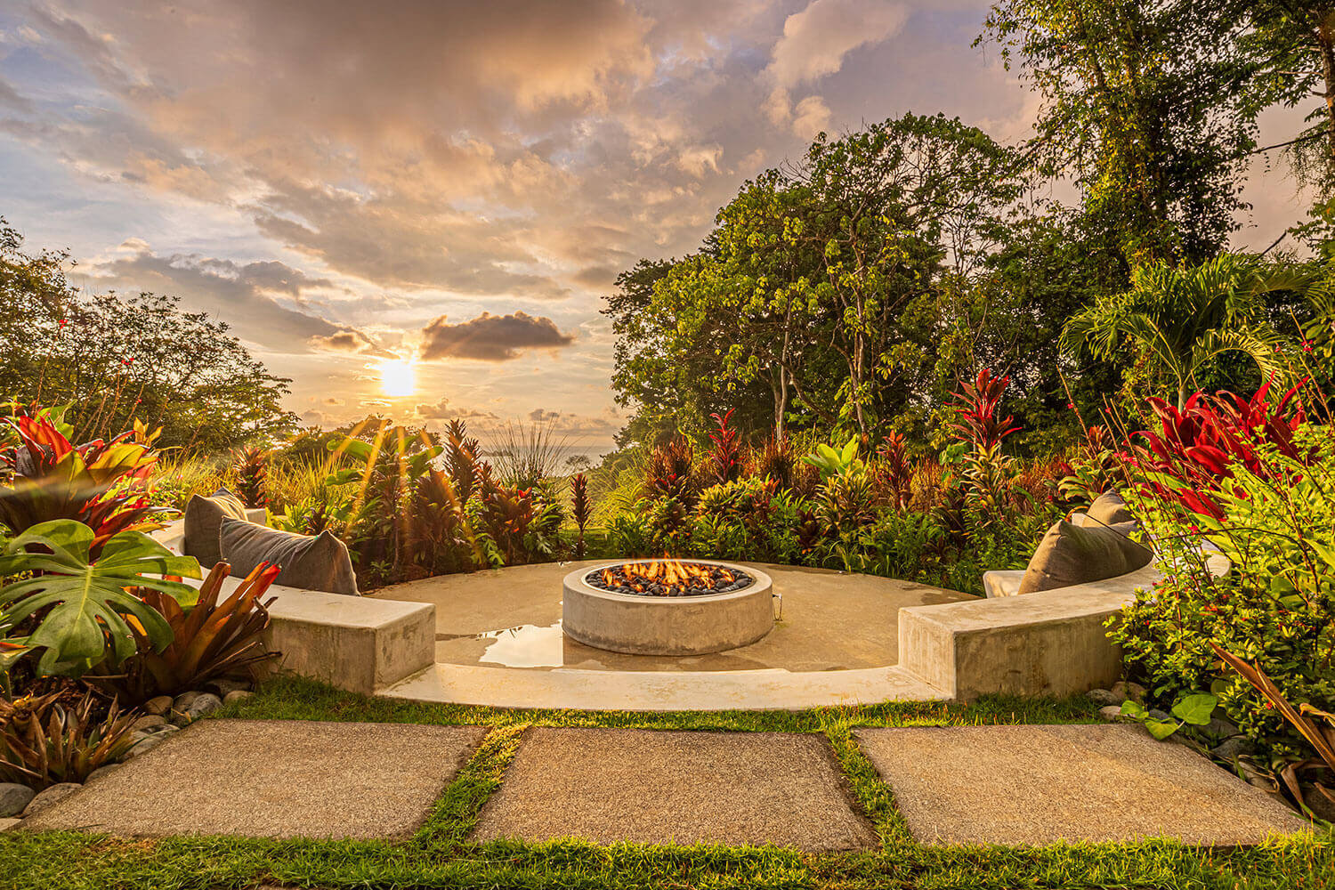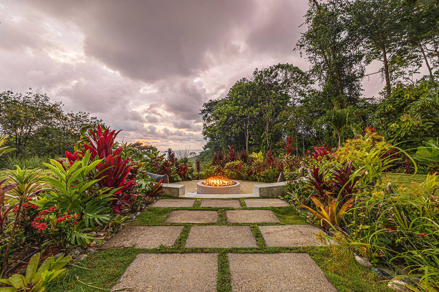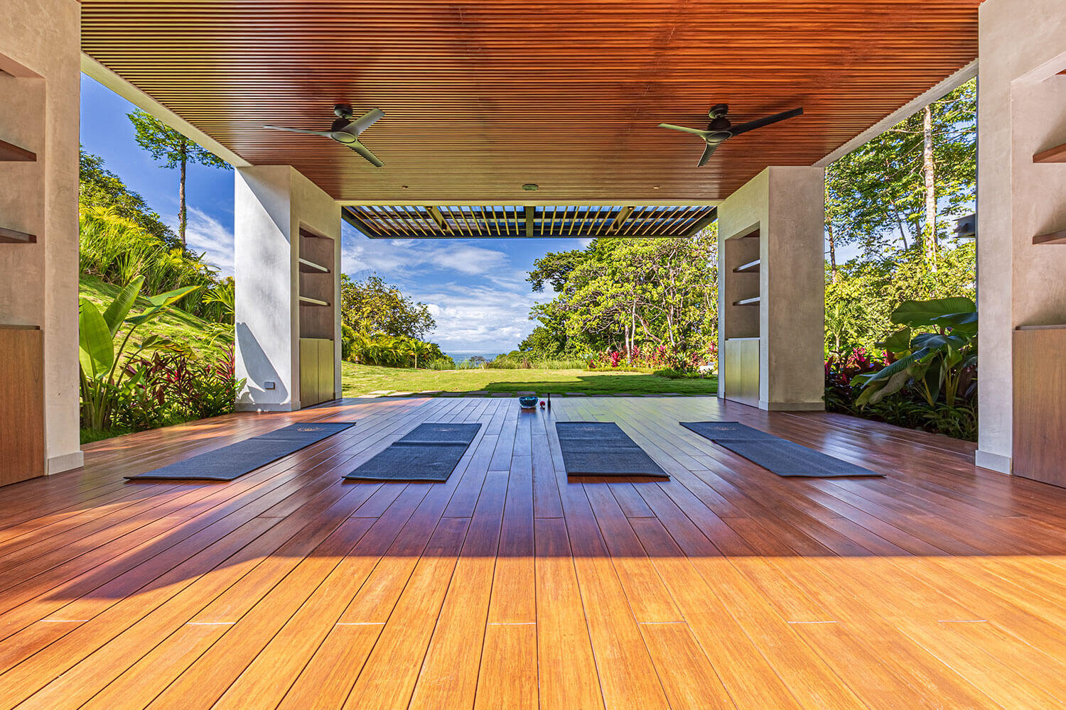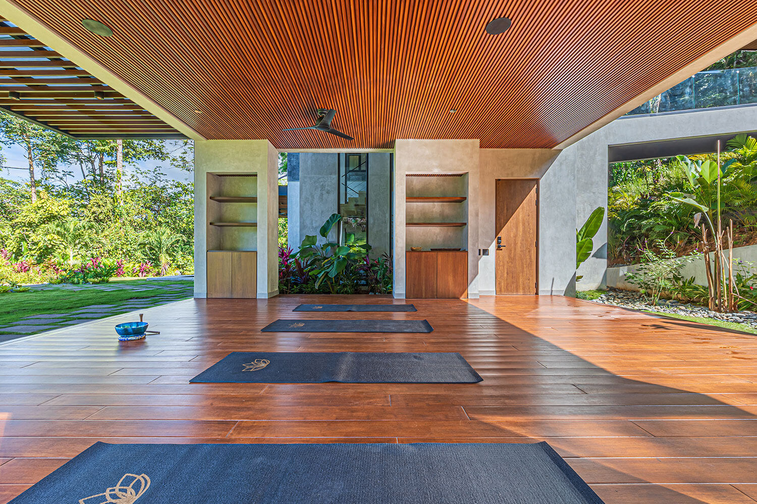 Lush tropical plants adorn the home, enhancing a sense of calm and connection to nature. A dedicated yoga deck is fully equipped with mats and singing bowls, while private jungle trails lead to a tranquil creek for meditative walks. Outdoors, guests can enjoy a stunning pool, firepit, and expansive terraces designed for relaxation, reflection, and gathering.